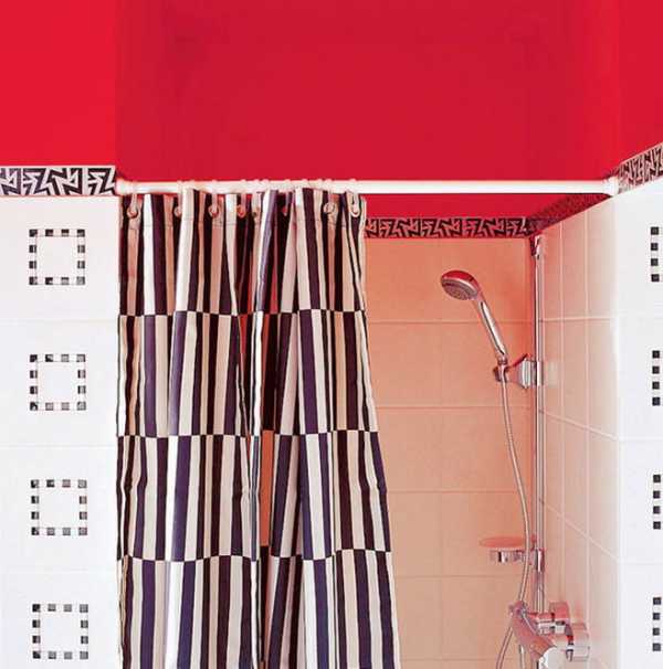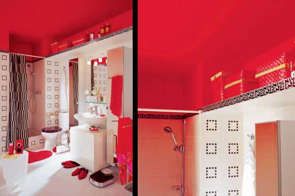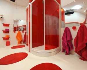 Шикарная контрастная душевая кабинка ярко-красного цвета в интерьере ванной комнаты.