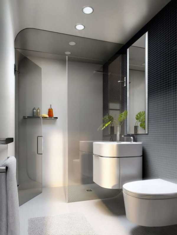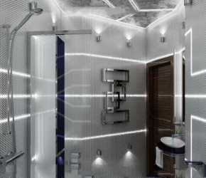 - Стиль хай-тек – это минимализм, тёмные глянцевые поверхности, компактная сантехника, точечное освещение, никаких мелких безделушек. Обдумывая этот стиль, стоит учесть, что тёмные цвета могут угнетать и быстро надоесть.
