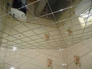 Самая распространённая отделка потолка – это хорошая побелка или покраска. Если ваша комната выложена плиткой, то на потолке её лучше не использовать. Навесные или каркасные потолки украдут лишние сантиметры помещения, но глянцевый навесной потолок компенсирует это. Зеркальный потолок очень увеличит объём, но этот вариант подойдёт не всем, а только смелым людям.