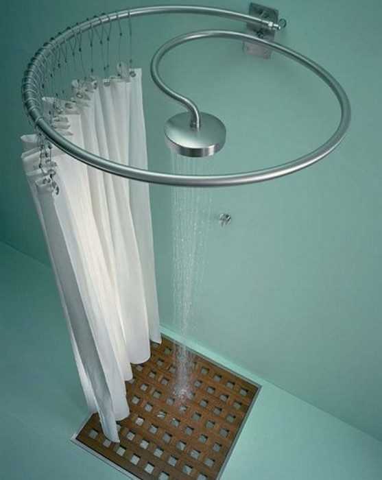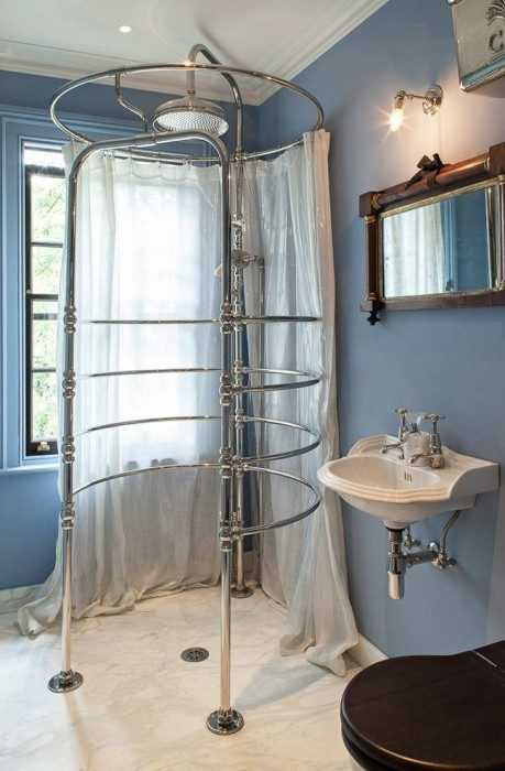 Для экономии пространства в ванной комнате вместо кабинки можно использовать раздвижные занавески.