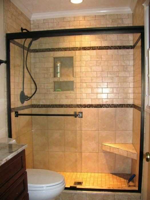 Эффективно зонировать пространство в ванной комнате удаётся путем размещения угловой или прямоугольной кабины либо возведения перегородки.