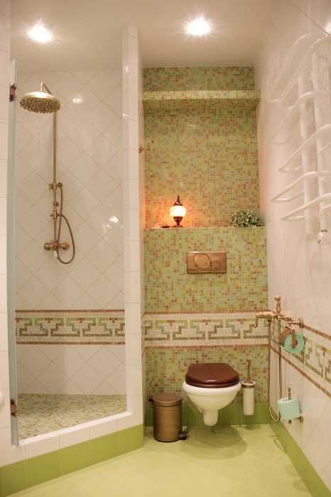 Совет! Хорошим вариантом для любого совмещённого санузла будет мозаика. С её помощью можно создать свой, индивидуальный стиль. Она может быть как по всем стенам, так и отдельный рисунок или узор.