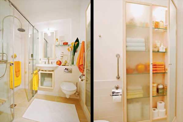 - Стеклянные раздвижные дверцы в душевой экономят место и расширяют пространство.