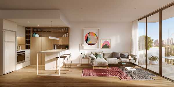 Интерьер этой кухни демонстрирует оригинальное использование деревянных элементов. Два монолитных модуля слева особенно интересны: они вплотную прилегают к узким перегородкам белого цвета. Соединённые горизонтальной панелью из дерева, они отделяют кухню от гостиной, но при этом не препятствуют проникновению дневного света.