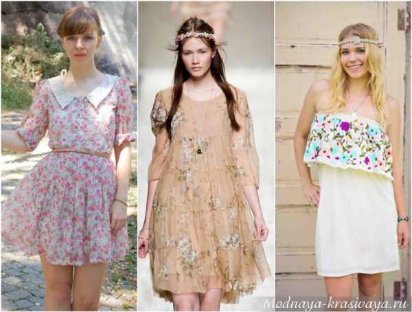 Длинные в пол платья с цветочным принтом соответствуют этому стилю. Лучше всего выбирать платье из натуральной ткани. Кружевные вставки, рюши, оборки, вышивка – один из этих винтажных элементов просто обязан присутствовать в качестве декора на платье.