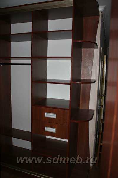 Процесс наполнения внутренностей простота шкафа купе с 2-мя дверями. Как видим планировка отличается простотой, поскольку проходит внутри шкафа купе, в ограниченном пространстве. Внутренности выполнены из ДСП.