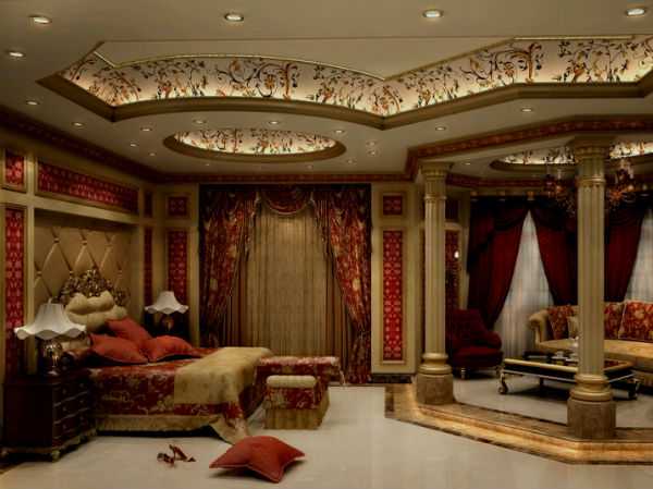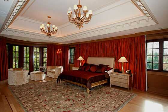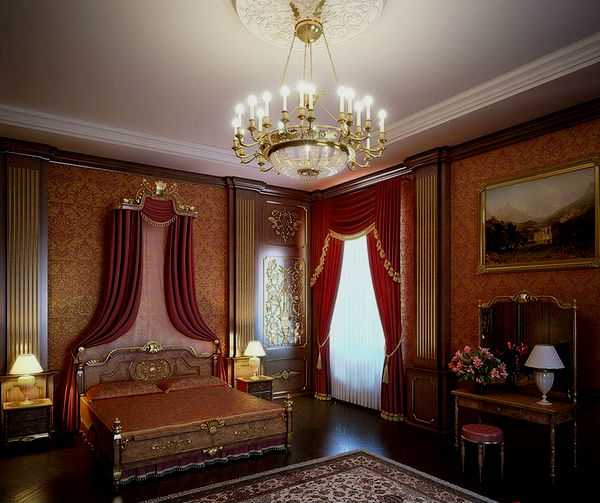 Красные расшитые золотом шторы в спальне – признак восточного стиля. Классическим сочетанием для спальни остаются: тяжелые ночные гардины винного или кирпичного цвета и светлый тюль.