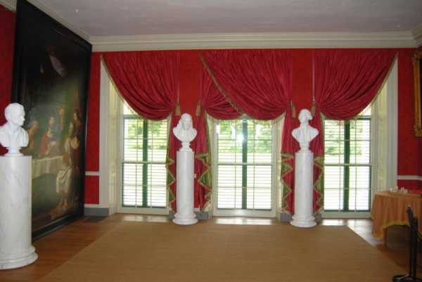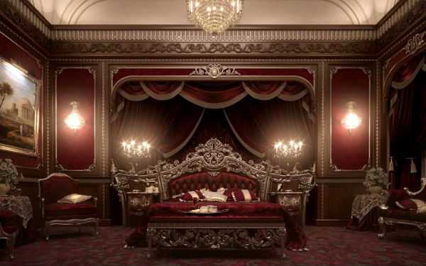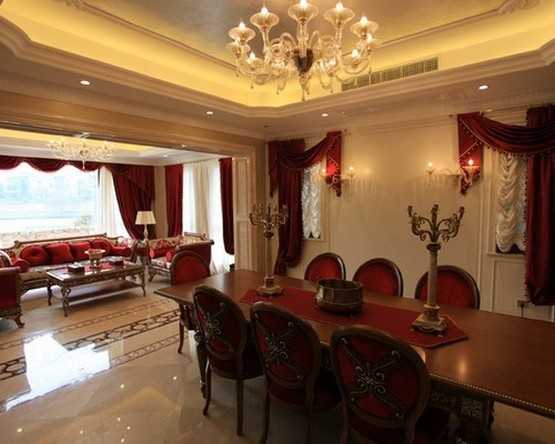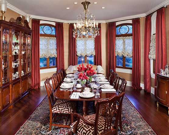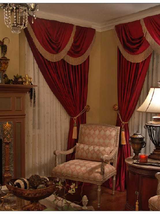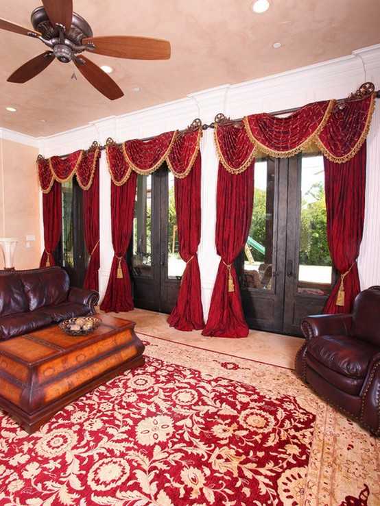 В роскошные интерьеры прекрасно впишутся и темно-красные шторы с бахромой и вензелями.