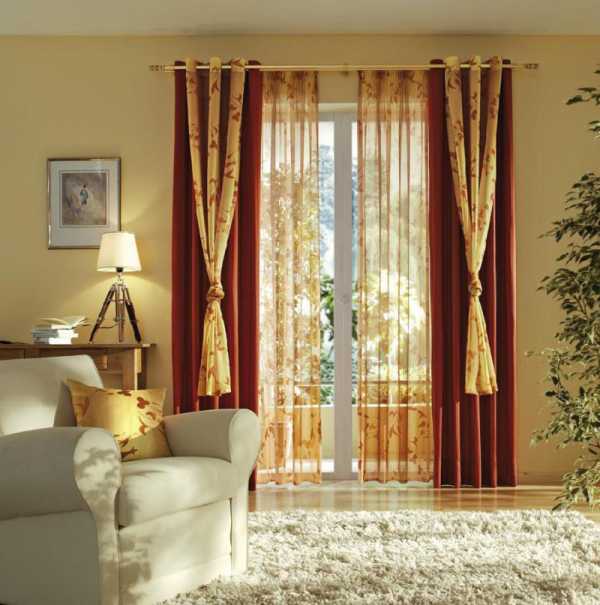 Сочетание красных штор в бархате и золотых ламбрекенов – торжественная и помпезная классика, уместная для больших залов. В гостиную, выполненную в пастельных тонах, можно попробовать сочетание внешних жаккардовых штор светло-золотого оттенка и внутренних бордовых штор, сшитых из атласа.