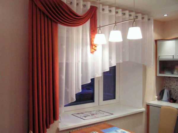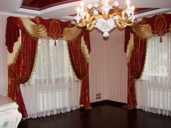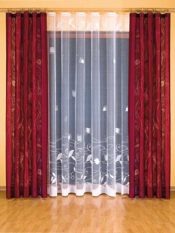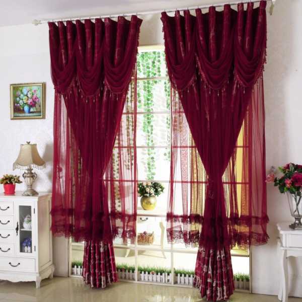 Взгляните на это фото. Плотные портьеры оттенка темного бордо дополнены светлой тонкой гардиной. Карниз с ламбрекеном удачно дополняет цветовую гамму.