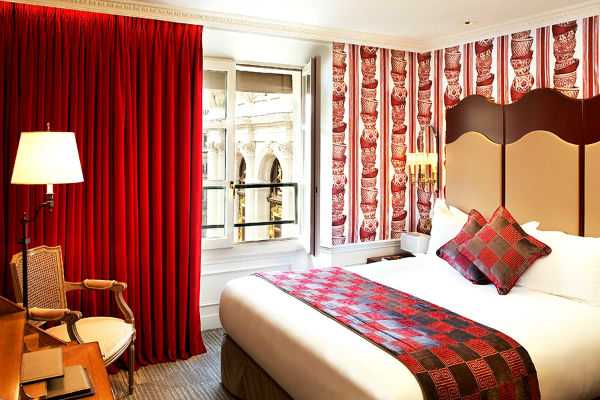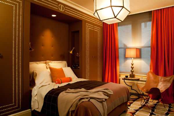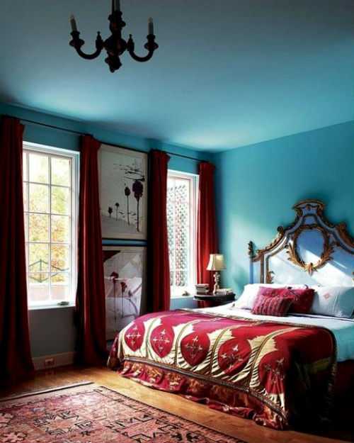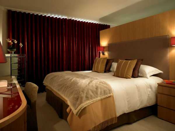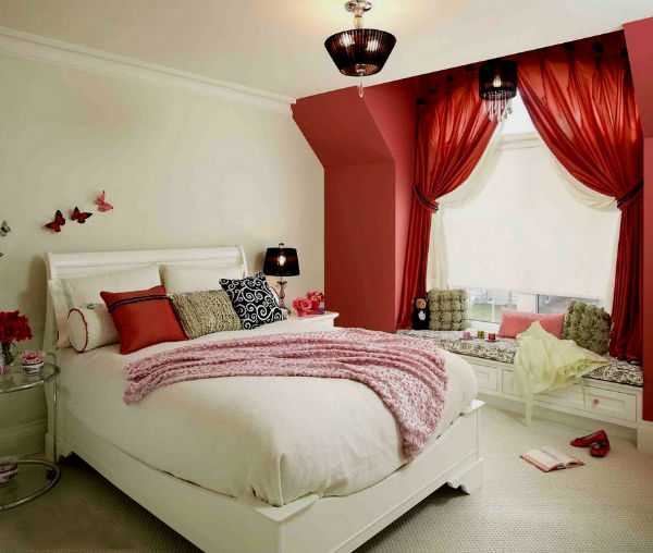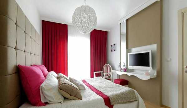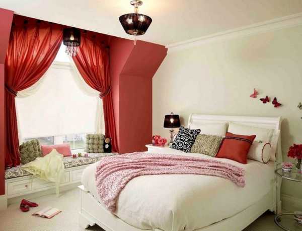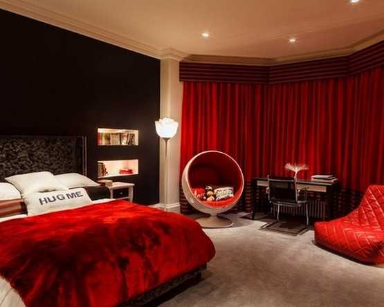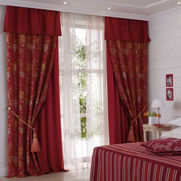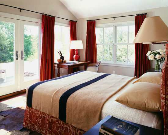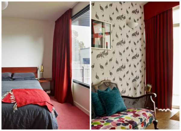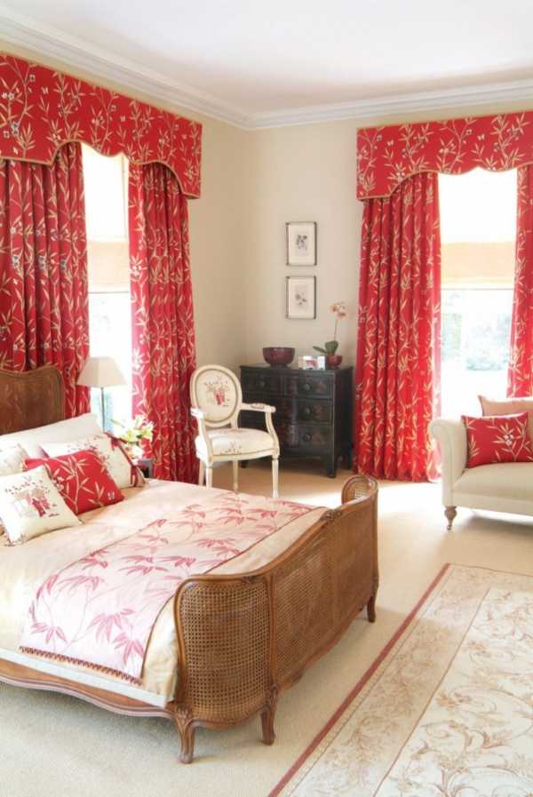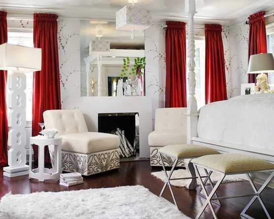 Красные шторы в спальне, фото.Красные шторы в спальне как подобрать покрывало.