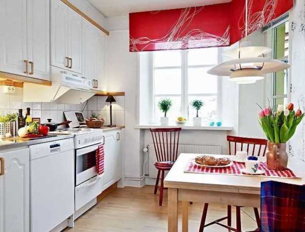 - занавески с красными цветами или рисунками больших размеров — неподходящее решение для маленькой кухни.