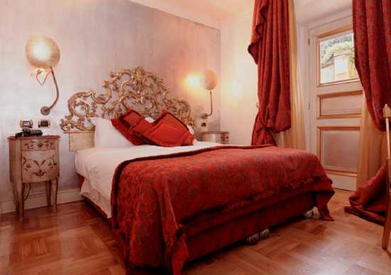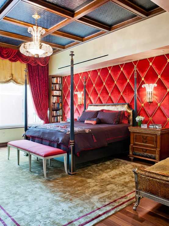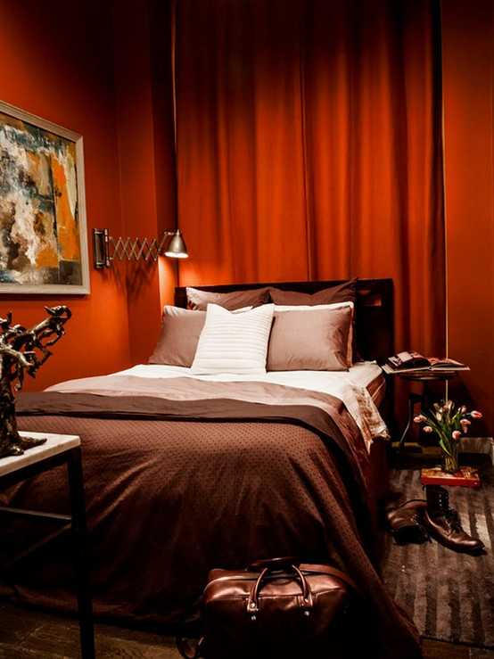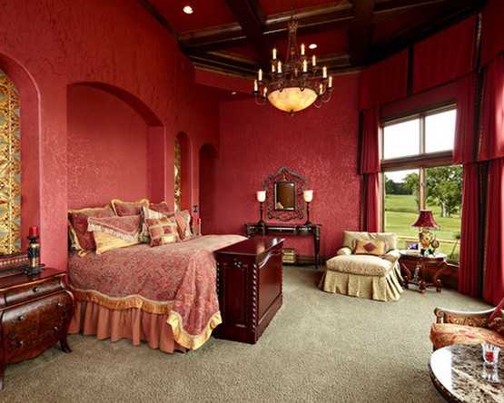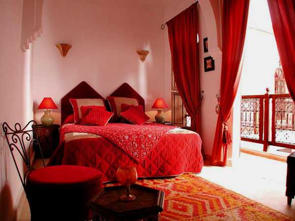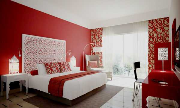 Спальня является местом отдыха, и использовать в ней красные цвета достаточно рискованно, но все же возможно. При этом они должны быть достаточно мягкими и приглушенными, чтобы способствовать хорошему отдыху и полноценному сну. В свою очередь, применение излишне ярких тонов наподобие алого, пунцового или цвета фуксии надо использовать с осторожностью, поскольку может создать в спальне излишне бодрую обстановку. Но активных людей это не остановит, главное, — правильно все сочетать.