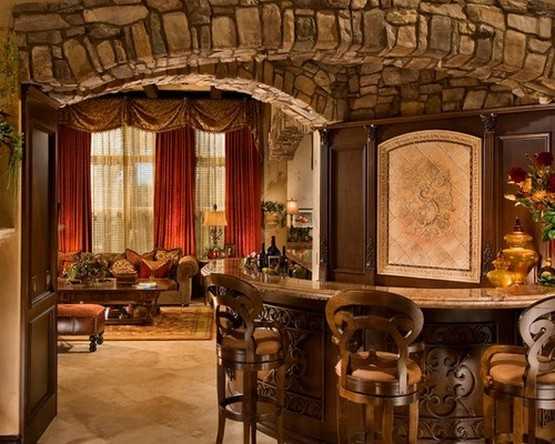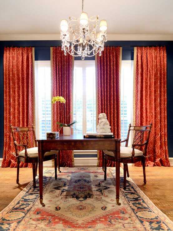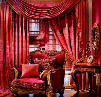 Именно благодаря бодрящему эффекту, применение красных занавесок в сочетании с желтыми и золотыми орнаментами уместно для оформления рабочего кабинета, мужского клуба или жилища холостяка.