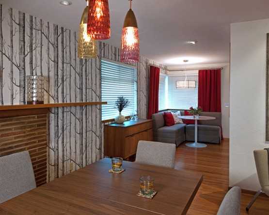 - Подбирая обои к красным шторам, необязательно приобретать какие-то однотонные полотна, можно присмотреться к комбинированным обоям, к примеру бежево-красным, бежево-золотым, или серо-красным.