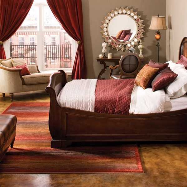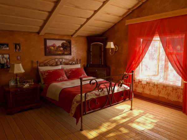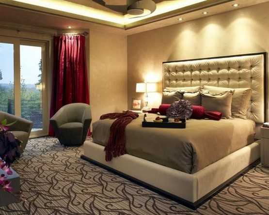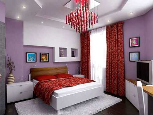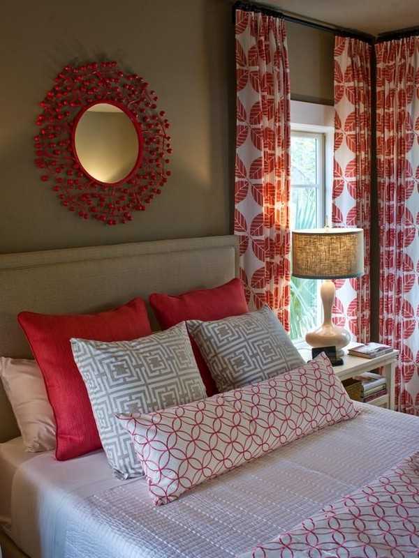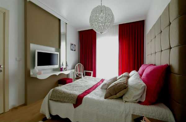 Покрывала и подушки нужно выбирать или шить только нейтральных тонов, а в красном цвете приобрести несколько аксессуаров. Если спальная комната небольших размеров, то к ней подойдут шторы не слишком насыщенного красного.
