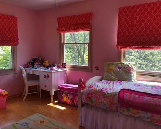 Маленькой девочке понравятся коралловые шторы или, к примеру, белый тюль с ламбрекеном насыщенного цвета. На полупрозрачной органзе или вуали могут красоваться красные розы.