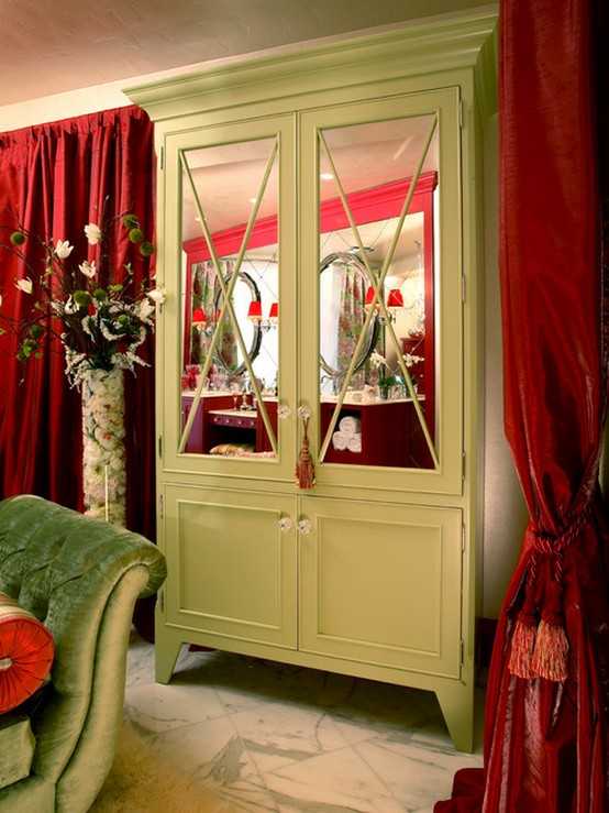 Довольно интересно выглядит комната, в которой встречается красный и зеленый цвет. Эти оттенки нужно сочетать в тех случаях, когда хочется придать помещению яркости и гармонии. Только шторы в этом случае должны быть не выраженно красными, а розовыми.