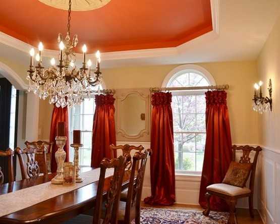 Красные бархатные шторы – один из элементов стиля барокко. Мягкие светлые оттенки красного (алый, кирпичный, киноварь, коралловый) оживят большой зал, которому не хватает естественного освещения.