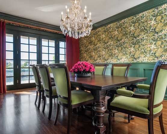 - Светлый зеленый или голубой тон обоев привнесет в общий стиль, нотки свежести и воздушности, в этом случае шторы не будут смотреться громоздко и вызывающе.