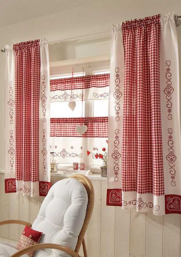 Если же шторы на кухню по вашей задумке должны содержать соответствующую фасадам яркость, красные элементы могут быть и в меньшинстве. Обратите внимание на занавески с красными маками, геометрическими фигурами, в клетку или в полоску.