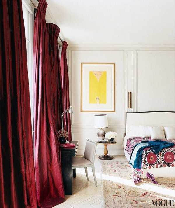 Впечатляющие красные шторы в спальне. Фото