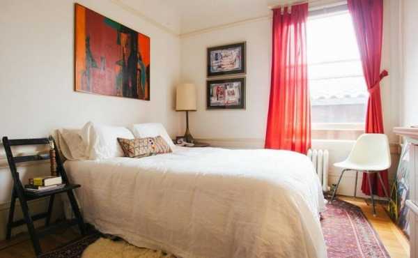 - Белые стены помогут создать акцент именно на шторах, в таком случае рекомендуем подобрать еще парочку красных аксессуаров, к примеру покрывало на кровать или яркие подушки, такой прием поможет уравновесить всю интерьерную задумку в целом.