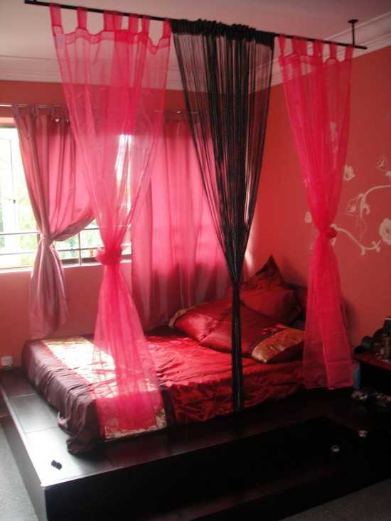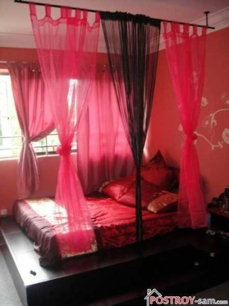 Органза подойдет не только для декорирования окна в спальне. Из нее можно сшить балдахин для кровати с подиумом, что придаст ей неповторимого романтизма.