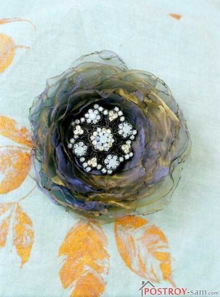 Простую и красивую шторку из органзы можно интересным образом декорировать. Для кухни можно использовать цветы на подхватах – милый и романтичный элемент.