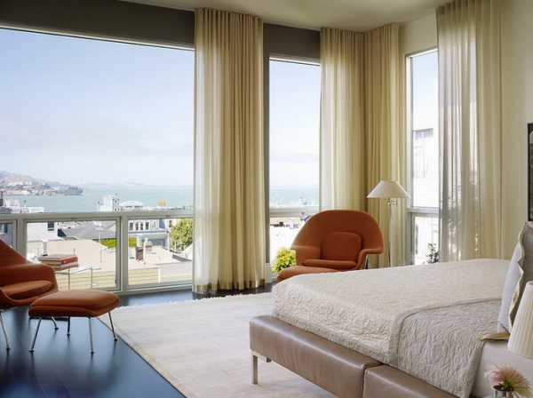 Большие витражи в спальне задрапированы органзой теплого коричневого тона