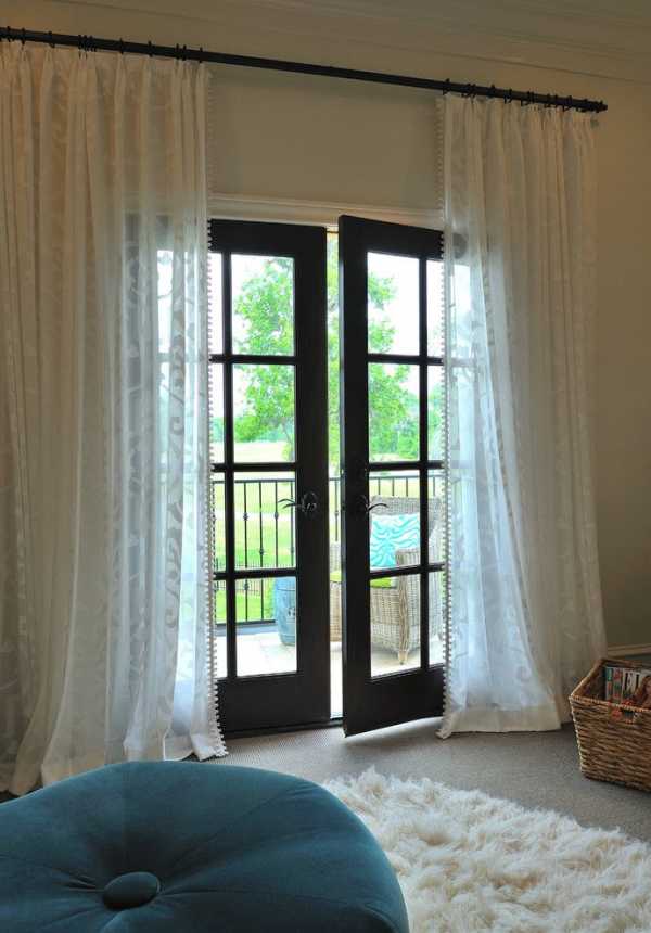 Оригинальным решением оформления окон в гостиной являются шторы из органзы на панорамных французких окнах. Они не будут собой закрывать всю красоту вида из окна, и вы сможете спокойно любоваться природным пейзажем, и при этом совсем не будет нарушена целостность интерьера.