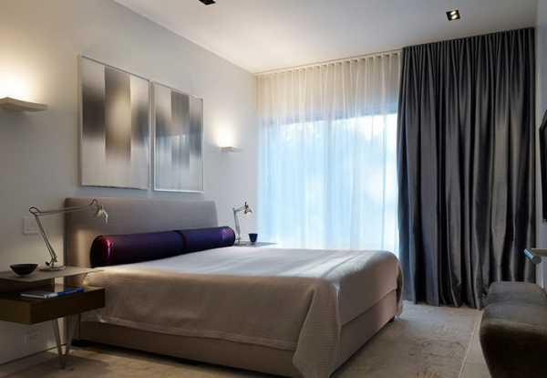 Спальня. Здесь эффектно смотрятся комбинации портьер из плотной ткани с воздушной гардиной из органзы. Такая гардина не даст шторам сделать комнату душной и загроможденной на вид. Однако и как самостоятельный элемент декора органза выглядит весьма красиво, воздушно и стильно.