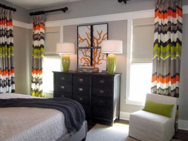 - Яркие контрасты помогают придать оригинальности (самый распространенный контраст — черно-белый, который используется в современных стилях, — придаст комнате элегантную строгость, также хорошо сочетаются шторы красные в полоску золотистую или белую, синие с бежевым, бирюзовые с белым).