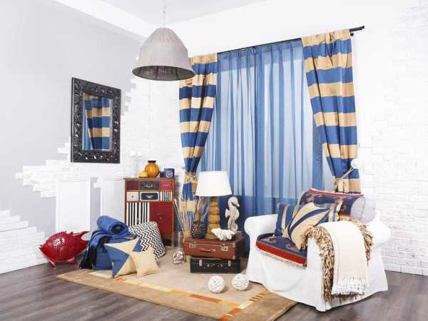 - если обстановка комнаты слишком обильна, а облицовка стен достаточно разнообразна, лучше применять портьеры с тонкими неяркими полосами, как показано на фото;