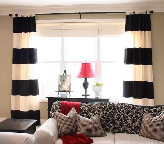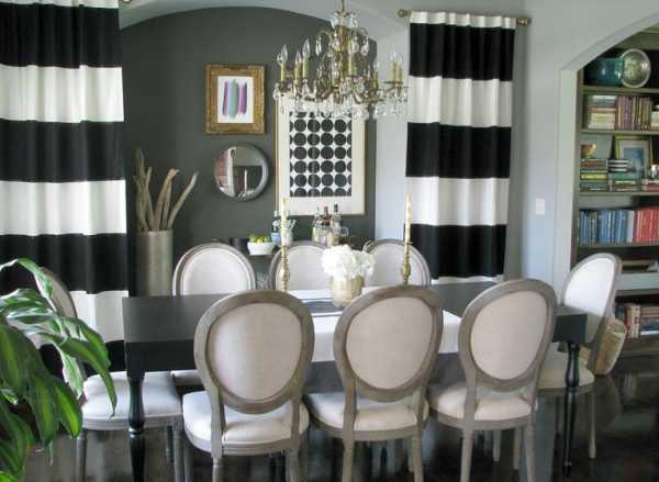 Шторы в полоску в интерьере, выполненные в чёрно-белых тонах, станут прекрасным дополнением к убранству комнат