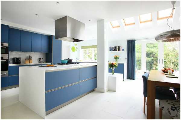 Синяя кухня благотворно влияет на фигуру – диетологи рекомендуют именно в этой цветовой гамме оформлять кухонное пространство людям, склонным к избыточному весу. Этот цвет снижает аппетит, и увеличивает промежутки между желанием принять пищу.