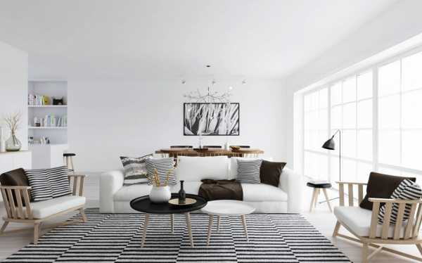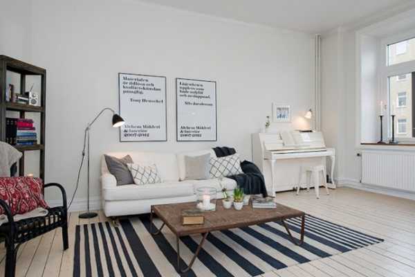 Еще одной интересной особенностью скандинавского интерьера являются тонкие коврики с полосатым или цветочным узором, много меха и густые ворсистые ковры.