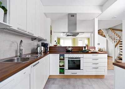 Обычно, для декорации стен на кухне используется белый кафель или мрамор. Также возможно добавление в интерьер натурального светлого дерева.
