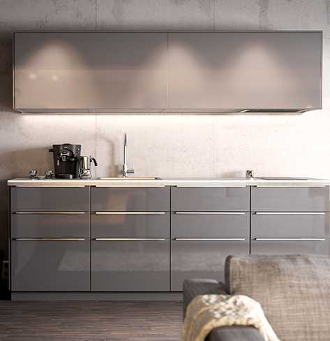 Оформить кухню в современном и лаконичном стиле помогут фасады с глянцевой отделкой.