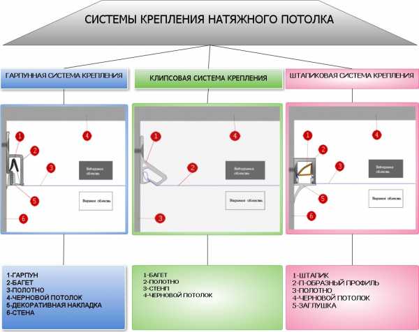Существует три варианта конструкции натяжного потолка, каждый из которых является главным основанием их классификации: