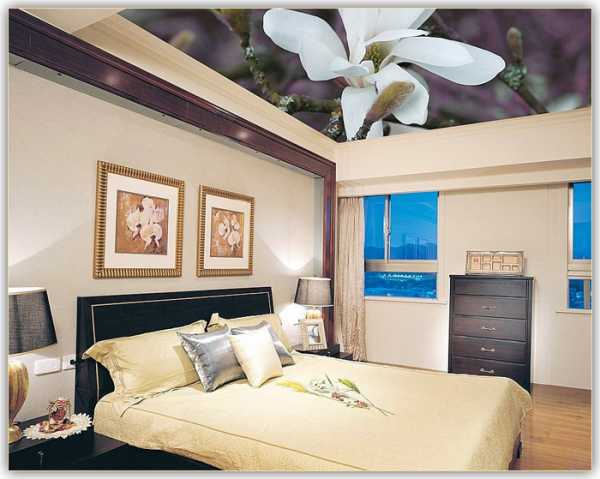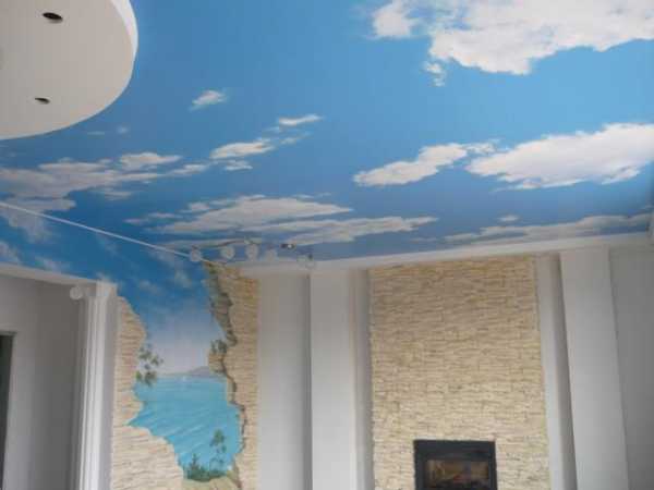 - Арт-печать (фотопечать на натяжном потолке). Из абсолютно серой обстановки могут появиться самые разные пейзажи. Это очень эффектно выглядит. Помещение при таком решении должно быть просторным.