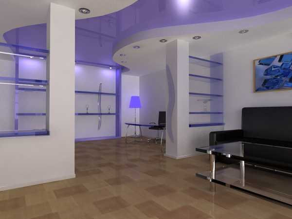 В качестве основы в такой конструкции натяжных потолков выступает каркас, изготовленный из металлического профиля. Дизайн такого потолочного покрытия может быть выполнен в виде плавных линий или, наоборот, строгих геометрических форм. Чтобы визуально расширить пространство комнаты, увеличить высоту и зрительно разделить на зоны, в подвесной потолок встраиваются точечные светильники, которые размещают по всему его периметру.