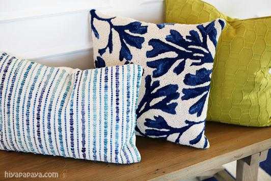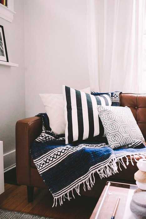 Синие декоративные подушки хорошо смотрятся на кожаном диване