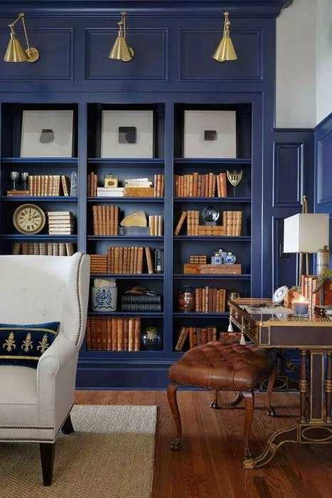 Благородный синий в интерьер библиотеки дополнен мебелью из натуральной кожи и дерева