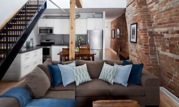В стиле лофт игра контрастов также уместна. Например, декоративные синие подушки будут отлично гармонировать с коричневым кожаным диваном и оголёнными кирпичными стенами.