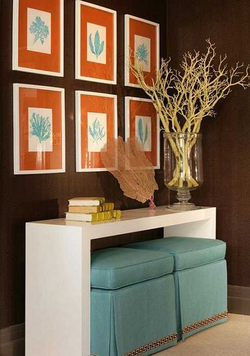 Сине-коричневый интерьер можно дополнить оранжевыми аксессуарами