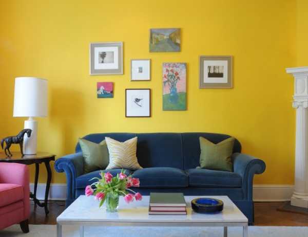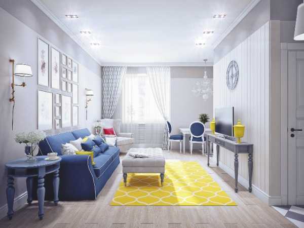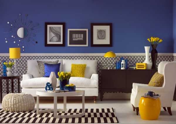 Гостиная. Палитра оттенков желтого и синего цветов очень широка. Однако здесь есть нюансы. Если окна гостиной выходят на солнечную сторону – уместно использование холодных оттенков. Если помещение трудно назвать хорошо освещенным, то более глубокий и теплый тон подойдет более всего.
