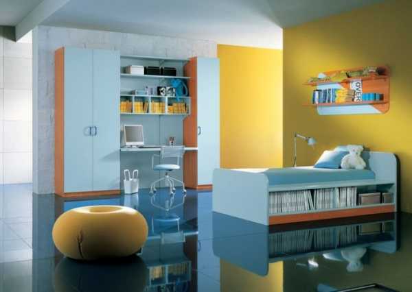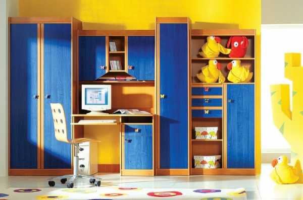 Детская. Желто-синий интерьер в ней используют достаточно часто. Пусть желтый с синим сочетается не в кричащей, а в пастельной, мягкой палитре. Тогда и атмосфера детской наполнится позитивом и жизнерадостностью.