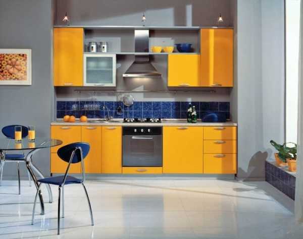 Голубой кухонный гарнитур на фоне светло-желтых стен или желтая мебель на светло-синем фоне выглядят очень эффектно.