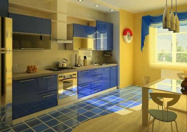 Кухня. Холодный синий нейтрализуется и уравновешивается жизнерадостной палитрой желтого. Тем, кто предпочитает видеть креативный желто-синий интерьер на своей кухне, можно выбрать кухонную мебель с желтым и синим фасадом. При этом чередование фасадов может быть как произвольным, так и рациональным.